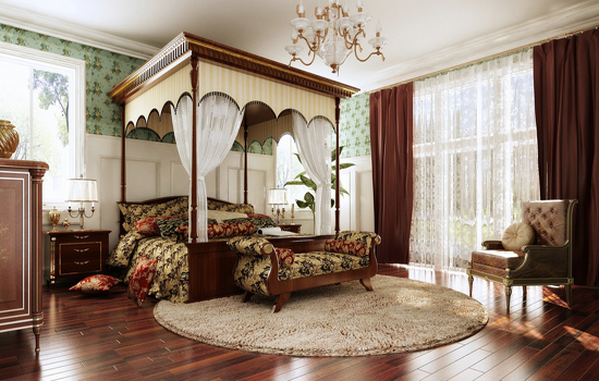 古典歐式風格的臥室,超強的奢華感充斥著整間房間,造型別致古樸的吊燈,霸氣高雅的歐式床幔設計,基色黃色黑色花紋的床上用品和紅色保證,盡顯貴氣,加之床邊的床尾凳,又為這間臥室增添了不少高貴的氣度。深棕色的實木地板,色澤純正,表面光滑有質(zhì)感。古典歐式風格,追求空間上的連續(xù)性,整件臥室,從上至下,無論是床幔支架的顏色,還是窗簾的顏色,亦或是家具和地板的顏色,整體色彩的連接都非常恰當好處,和地板近乎同樣色系的木質(zhì)家居,造型簡潔卻很精致,線條簡明卻很大氣,與質(zhì)地獨特,腳感舒適度十足的地毯搭配的相得益彰。