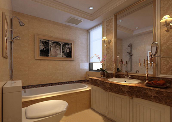 歐式風格的家居要用家具及軟裝飾來營造一個房間內(nèi)的整體效果,衛(wèi)生間可不例外。古典歐式衛(wèi)生間的設計主要是以淺色為主,深色的為輔,墻面外包花紋瓷磚,與深色的臺面形成對比,讓衛(wèi)生間整體給人的感覺就是簡潔大方,復古時尚的歐式鏡前燈發(fā)出暖暖的鵝黃色光,浪漫又帶意境的燭臺,搭配著墻上的裝飾畫,這樣的設計,令整個衛(wèi)生間空間的感官上在絲絲浪漫情懷和點點優(yōu)雅柔和中頗感溫馨舒適,置身其中,暢享體驗歐式古典格調(diào)的唯美。