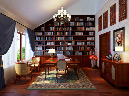 書房:書房是房主人用來(lái)辦公學(xué)習(xí)的地方,中式田園風(fēng)格的書房自然不能少了清幽淡雅的感覺(jué)。對(duì)于中式田園風(fēng)格書房的設(shè)計(jì),田園的氣息要從細(xì)微之處體現(xiàn)整體上則要以平間簡(jiǎn)潔的元素為主。綠色是大自然的主打顏色,啞綠作為書房的主色調(diào),可使得這個(gè)書房即雅致有很有穩(wěn)重感,與淡綠色的窗簾相呼應(yīng),甚是和諧。當(dāng)然,深木色的主題色調(diào)也是很適用于中式田園風(fēng)格書房的色調(diào),沒(méi)有雕工細(xì)膩繁雜的雕花,少了那份柔美,卻多了幾分硬朗,與書房氣氛相得益彰。