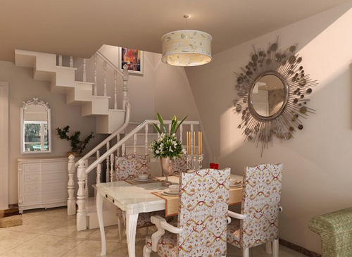 法式田園風(fēng)格在設(shè)計(jì)時(shí),空間結(jié)構(gòu)要呈開(kāi)放式,造型對(duì)稱。巧妙運(yùn)用雕花線板和圖案來(lái)裝飾空間,線條多為曲線,曲線的運(yùn)用可以使得整體感覺(jué)不會(huì)那么刻板規(guī)矩受約束,產(chǎn)生的則是曲線帶來(lái)的優(yōu)雅感覺(jué)。在法式田園風(fēng)格家居中,最顯著的特點(diǎn)在于對(duì)家具的洗白處理和大膽的配色方面。洗白家具能很自然的流露出古典家具的雋永及細(xì)膩的質(zhì)感,椅腳的設(shè)計(jì),完美曲線,精美的紋飾,優(yōu)雅油然而生。