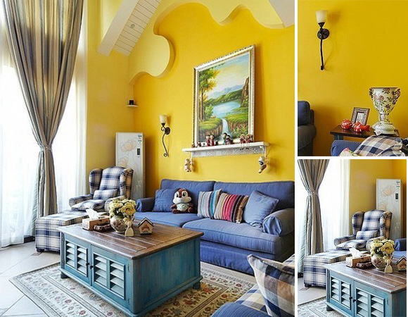 黃、藍紫和綠系列搭配體系是地中海風(fēng)格辦公室裝修、賓館酒店裝修裝飾等工裝,和家庭辦公室、別墅裝修裝飾等家裝中色彩應(yīng)用率低于藍白色系列搭配的第二大奇特色彩應(yīng)用,是取自于南意大利向日葵、法國南部薰衣草花田中,金黃色、籃、紫花卉和綠葉相映襯,頗具情調(diào)的色彩組合,所以是又一大自然色彩組合成的地中海風(fēng)格室內(nèi)裝修裝飾色彩應(yīng)用景觀。