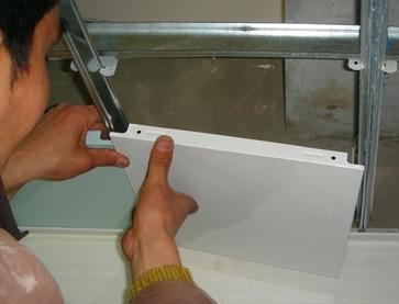 主龍骨、吊桿、吊件等集成吊頂中的架構(gòu)矗立起來后,就可以安裝扣板天花了,鋁扣板是辦公室裝修裝飾等工裝,或家庭裝修裝飾等家裝中,應(yīng)用最多的天花,安裝時(shí)要先把鋁扣板的邊緣夾入龍骨夾縫中,然后用力把吊頂向上托,使鋁扣板邊緣全部固定到龍骨夾縫里,同時(shí)還需對照相鄰的鋁扣板位置,進(jìn)行調(diào)整,就是做到整齊劃一,也就是要把相鄰的兩塊鋁扣板邊緣完全沒入同一龍骨夾縫中,才能牢固而不松動(dòng)。