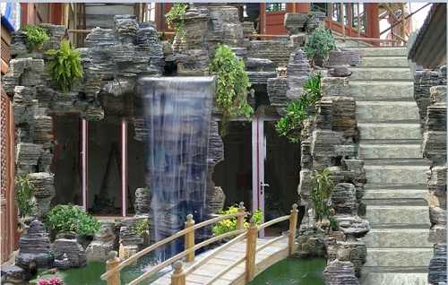 用山石做卷邊處理,雖然不太符合自然物象,但是只有這樣才能確保瀑布沿著墻體、山體比較平穩(wěn)地滑落下來,并且最好再作坡面處理。在進(jìn)行瀑布的設(shè)計(jì)和建造中,還必須事先確定好瀑布的水量,這樣更有助于讓瀑布產(chǎn)生最佳的視覺、聽覺效應(yīng),因?yàn)樗看舐洳畲,水聲更響,氣?shì)更壯觀,而如果是水量小,落差大卻讓瀑布失去了真正的內(nèi)涵,難以激起人們的興致,反而會(huì)人們失落很多。